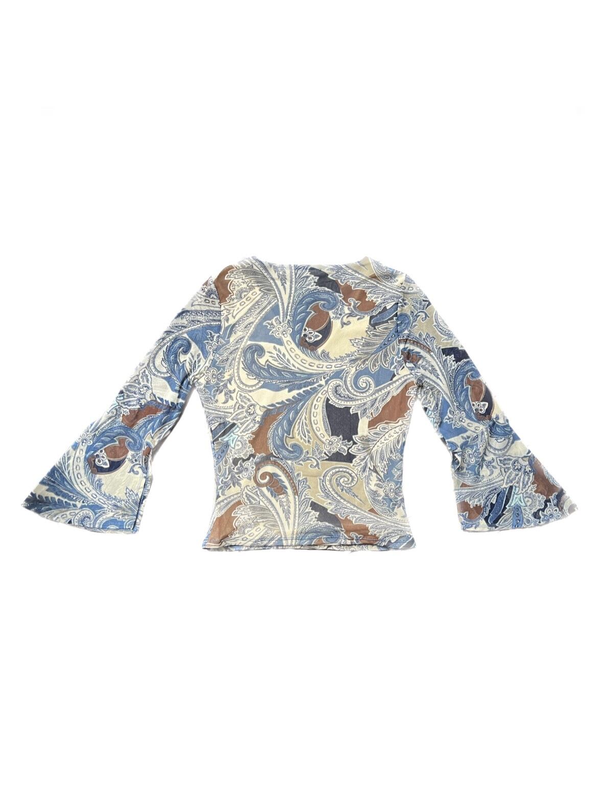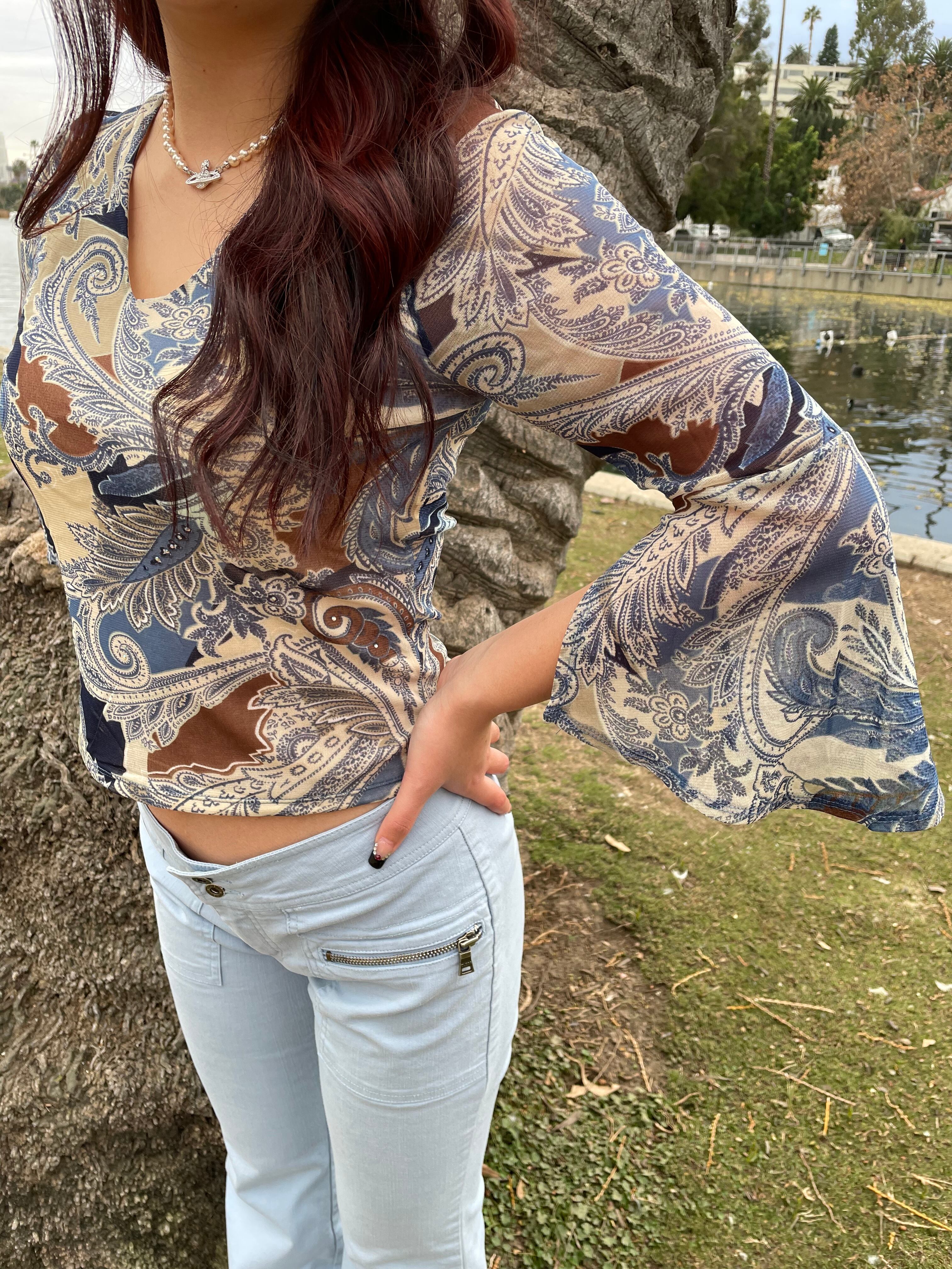 鮮やかなブルーにストーンが散りばめられていてるトップスは袖が広がっていて形が綺麗な一枚です。