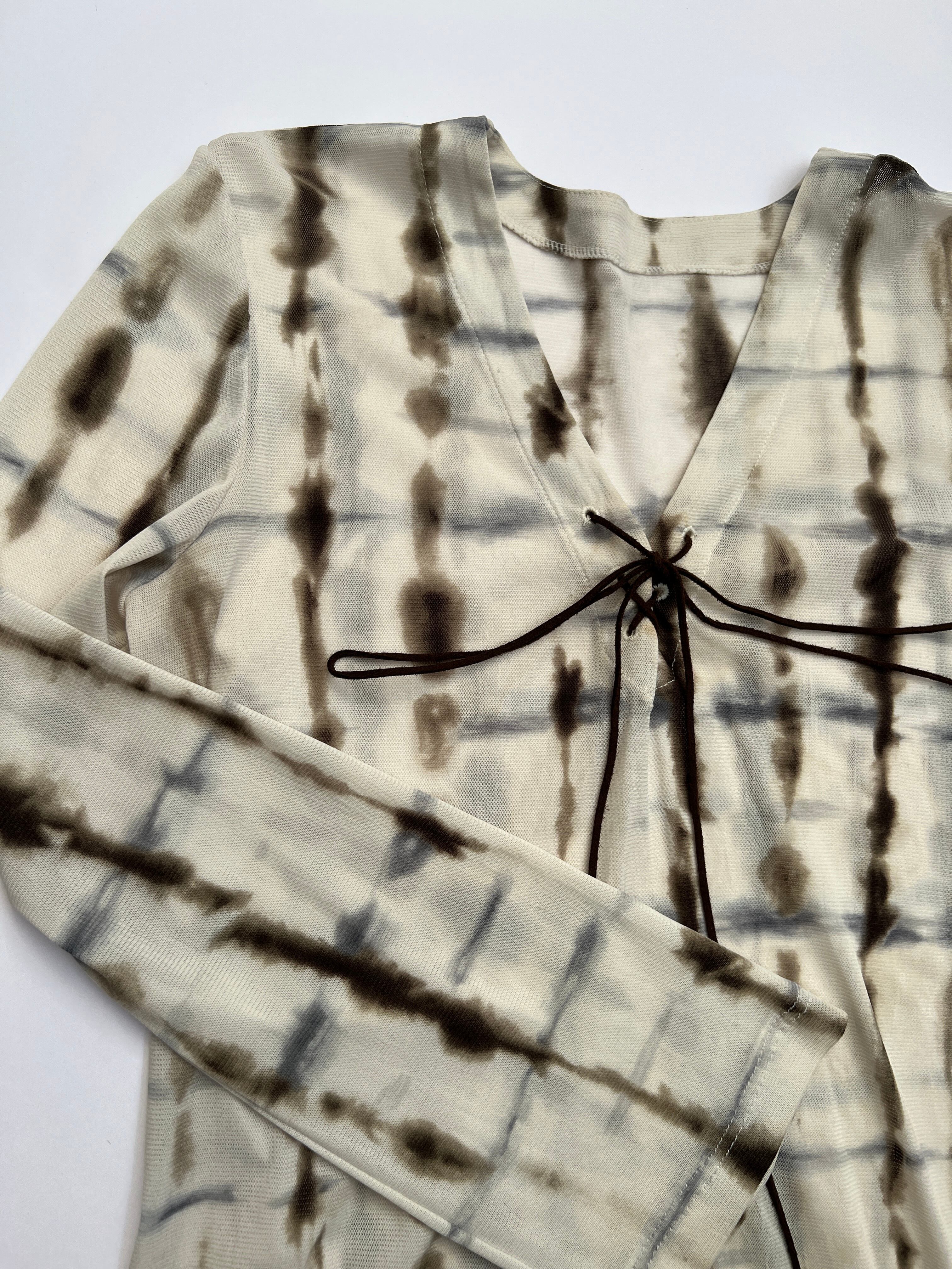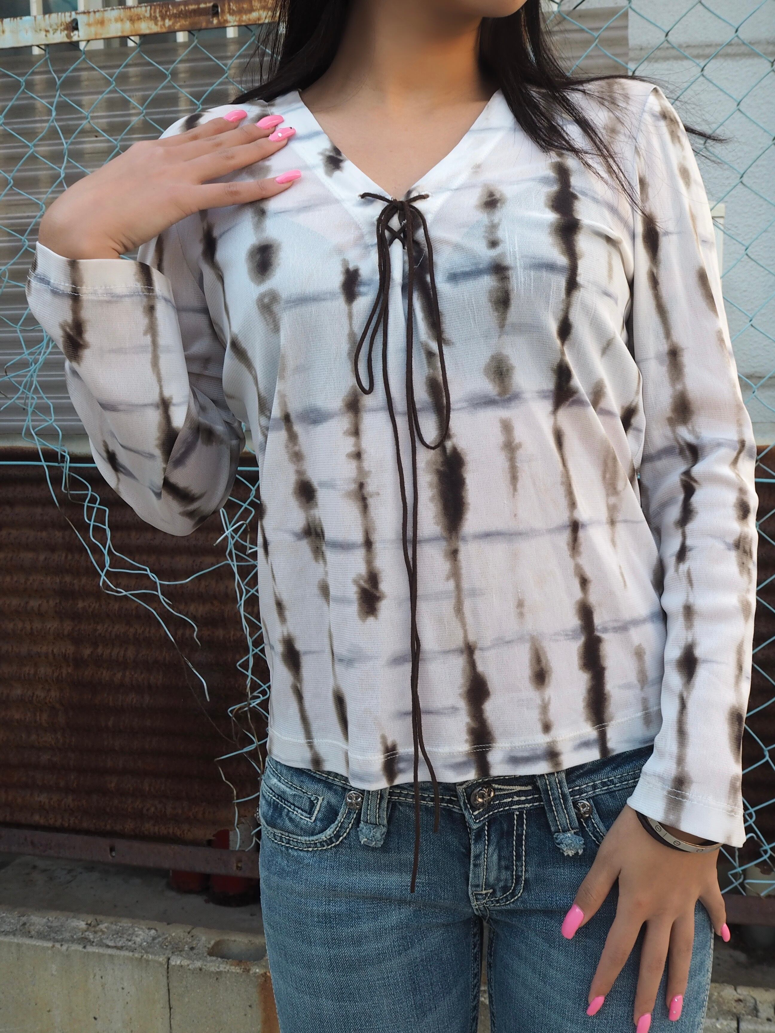 タイダイ柄の透け感があるこのトップスは中に見せブラや可愛いトップスを着て着回して、下は短めのスカート、デニムやフレアパンツ、ウェスタンブーツと合わせてカウガール風にしても可愛い!
