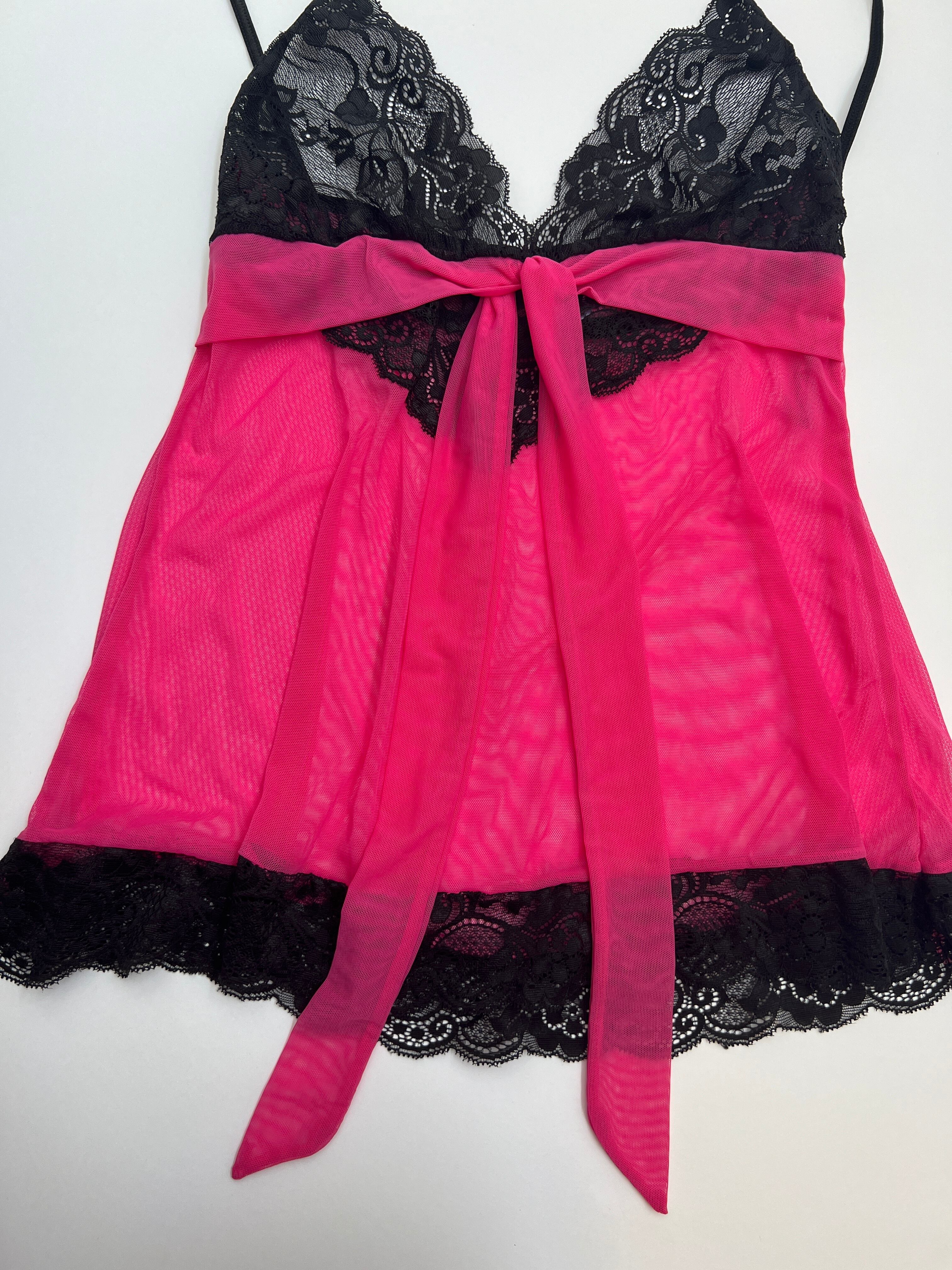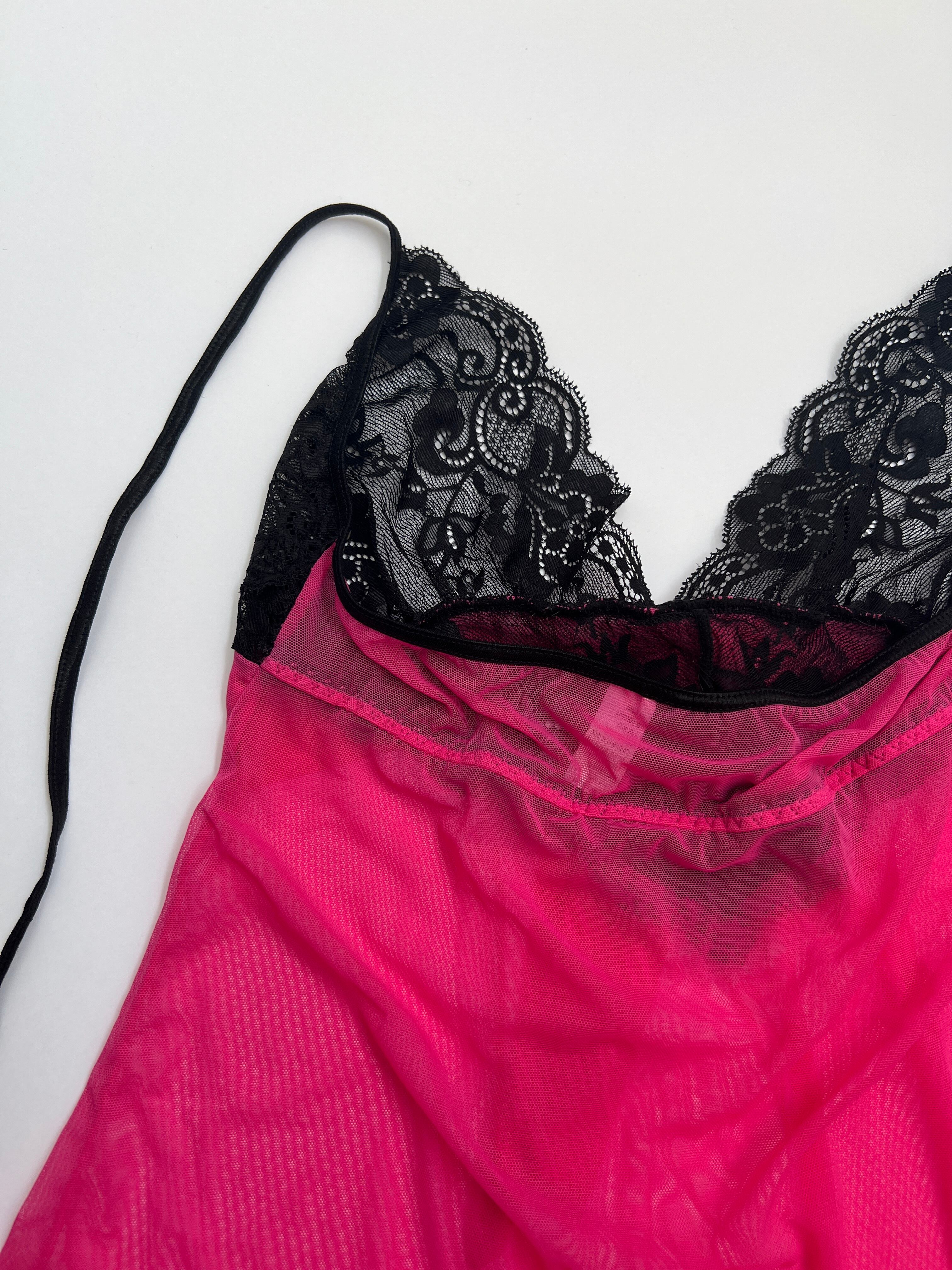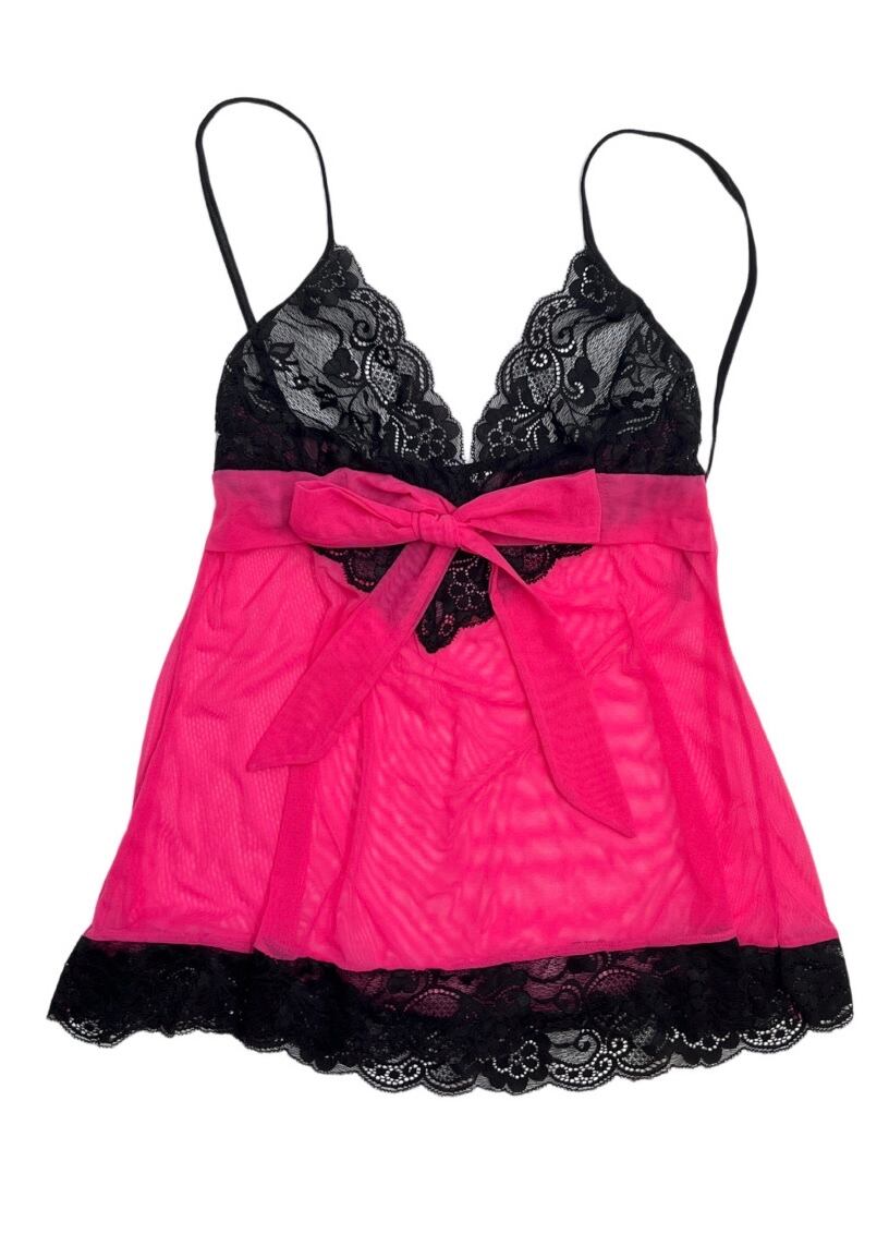 ブラックとピンクの色の組み合わせがたまらなく可愛い!胸元と裾にレースが施されておりピンクの部分は透けててセクシーなキャミ。